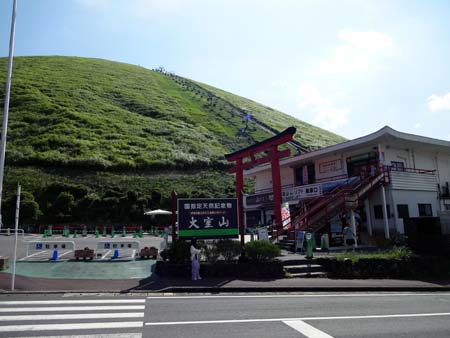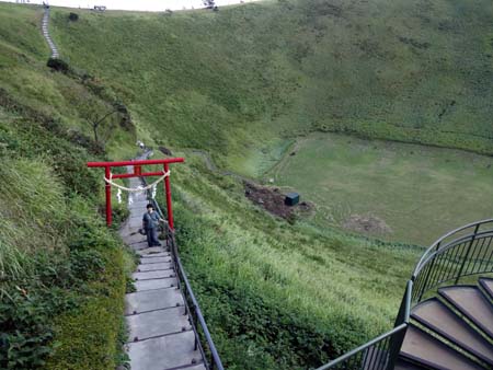 すり鉢状の火口に続く小道に鳥居がある。アーチェリーができるけど誰もやってない。値段高いし暑いし、ね。