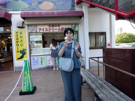 本わさびアイスクリーム、350円。すぐ溶けて垂れてきてしまうが、美味しい。 まゆは、ここの2階にあるお土産屋さんで職場用に大室山のイラスト入りクッキーを購入。