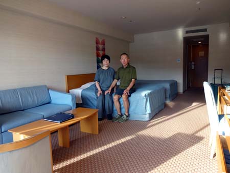 年季は入ってるけど清潔でゆったり広々とした部屋。ベランダから海が見える。 iPhoneの充電器を忘れたのでホテルで借りた。まゆが間違えてイヤホンを持ってきてしまったのだ(^_^;)
