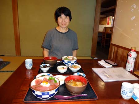 鯵丼2,200円と鮪丼2,200円。伊豆名産の鯵とたれたっぷりな鮪が大量に乗っている。採れたて新鮮な感じでとても美味しい。良いところ見つけた。 刺身がとても沢山乗っているので腹いっぱいになった、っていうかお腹が苦しかった。刺身もご飯も量は半分で十分な感じ。