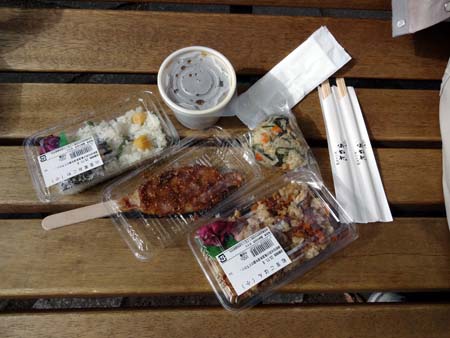 「農家の台所きさら」でお弁当を購入して、ベンチでお昼 岐阜公園でお弁当を買って次に行く「ぎふメディアコスモス」のフリースペースで食べる予定だったけど、ちょうど良いベンチもあったのでここで食べることにした。持参したお茶を車まで取りに行った。