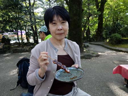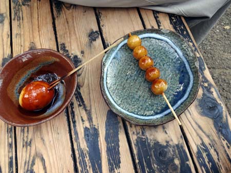 でんがく処むらせで、卵の味噌おでん150円、みたらし団子120円。
