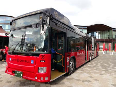 そして、岐阜市立中央図書館へ 堤外第一駐車場を出て約5分、岐阜市役所のとなりに立体駐車場がある。30分100円だが、施設を利用する場合は2時間まで無料。 みんなの森ぎふメディアコスモスは、2階に木製格子屋根のある岐阜市立中央図書館が入った複合文化施設。建築家伊藤豊雄設計。 みんなの森ぎふメディアコスモスと岐阜市役所の間の広場「みんなの広場カオカオ」で自動運転バスや連節バス、古い車を展示していた。ここでは、市民向けにいろいろなイベントをするらしい。