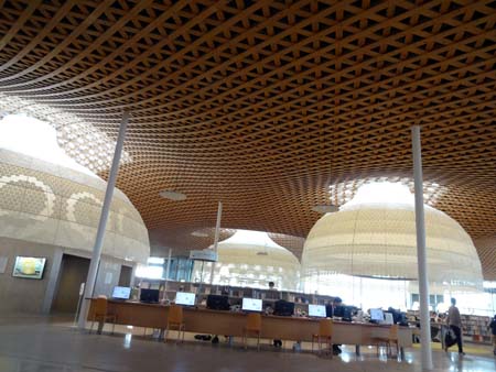 岐阜市立中央図書館 みんなの森ぎふメディアコスモス2階にある、まゆがとっても訪れたかった図書館。天井に木製の格子とスライムみたいな提灯。凄く広い。座るところがとても沢山ある。いろんなコーナーやいろんなタイプのイスやソファがあってゆっくりとくつろげる。自宅から徒歩圏内にあると超うれしい。