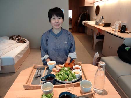 7:30 朝食は部屋に持ってきてくれる。メニューは全く選べず決まったもの。だからか、いろんな人に対応できるよう肉魚は無く、タンパク質はチリコンカンやスムスの豆、目玉焼きだった。 部屋に持ってきてくれるのも、メニューが選べないのも、ちゃんとした厨房や大勢が集まれるレストランっぽいスペースがないからだろうなと思った。 カフェはあったけどレストランは無い。大浴場も無い。スリーパーはホテルオリジナルで良い感じ。販売もしてた。スリッパはまゆには大きすぎてイマイチ。