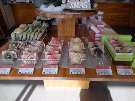 12:10 前日にホテルで買って食べた花咲かりんの本店があったので寄った。本店はちょっと安かった。 チョコかりん箱入り1,960円、お徳用のわれかりん(製造過程で割れが出た時だけ販売、5枚入り)380円、プレーン180円、塩味230円、チョコかりん360円を購入。 1枚1枚手揚げしてあるお花の形をしたお菓子。今回の旅行で初めて知ったお菓子。いわゆる”かりんとう”ではないけど、サクサク触感で美味しい。甘い味から塩気のある味、チョコがけなどいろいろあってどれも美味しい。