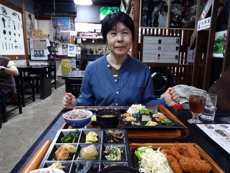 13:00 伊賀の紹介番組で必ずっていうほど出てくる食堂。壁に忍者グッズが飾られていたり、忍者メニューがあったりして、観光客や外国人に人気。 合言葉"”忍者”というとソフトドリンク1杯ゲット。 ふたりともデラックス定食1,400円 おかず9品とメイン一品に汁物。 まゆはサンマの焼魚、僕はミックスフライ(イカリング、アジ、ひとくつカツ、カニコロッケ)。ご飯は黒米めし。 ちまちましたおかずは美味しかったけど、サンマは細身で悲しかった。