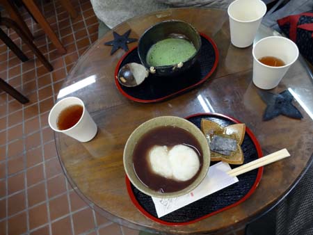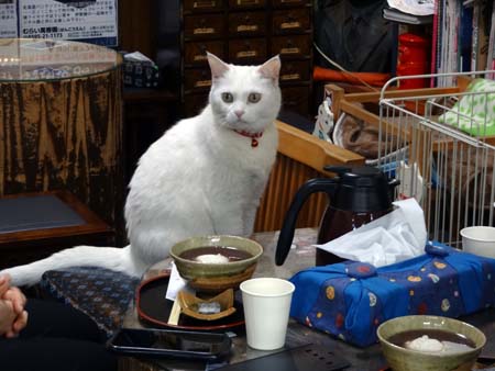 14:00 ここも、伊賀の紹介番組で必ずっていう程取り上げられる、創業100年余、伊勢茶を扱う老舗茶屋。 お抹茶500円 ぜんざい(伊賀餅入り)800円 とても美味しかった。 この看板猫を目当てに来る若い女性観光客も多く、甘味で流行ってる。猫は女の子らしい。 店主はテレビで見た時も、「先祖が忍者で…」って面白かったけど、実物もいい味を出していた。「2人なのにお茶3つ持ってきちゃいました」ってお茶3つおいてってくれた。
