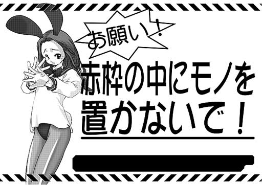 ▼あ、なんか急に当日になっちゃったし(27日)。とりあえず現在、ロイヤル・カフェテリアで矢野さんとWatariさんと食事してるっす。たぶん、このあとこの日記FTPして、前日設営の消火設備回りの張り紙かな?今年の「赤枠内に物を置くな」張り紙はわしの作ですんで、ひとつよろしく。せらばには…ないっす(;_;)描いたタイプもあったんだけど、諸般の事情により、没。