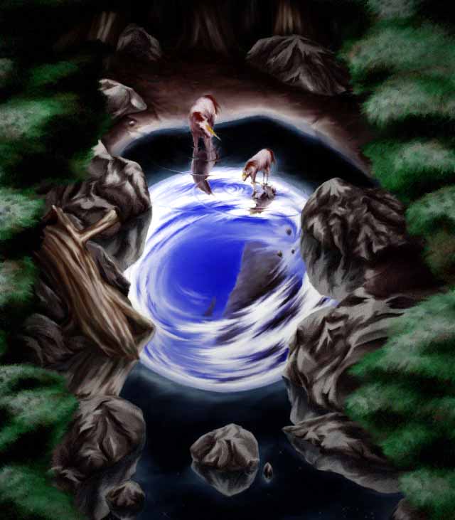 私にしては珍しくほとんど背景のみの構成になっています。美少女キャラだけでなくこんなんも描くんですよ、私。もっとも全然細部がなってませんが(^^;)。木なんか木に見えない(^^;)。まぁ若い頃の所行なので勘弁してください(^^;)。