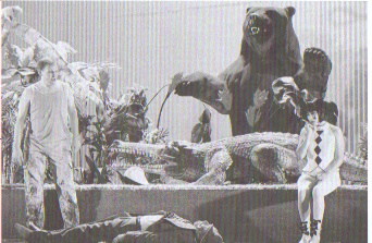 死んでしまった医事官(中央)を前にするルル(右)と画家(左)。背景の動物は悪趣味。