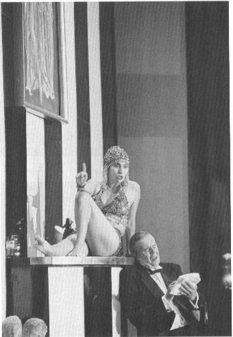 第1幕第3場。婚約破棄の手紙を書かせているルルと泣きながら書いているシェーン博士。 カラーでないのが惜しい。ルドンのサロメをイメージしたG.フリードリヒ演出の「サロメ」から借用していることはすぐに分かると思います。 黄金をジャラジャラ言わせ、あの足をシェーン博士に絡めて艶めかしく歌います(なお、ドイツのオペラ雑誌でカラー写真を見た記憶があります)。