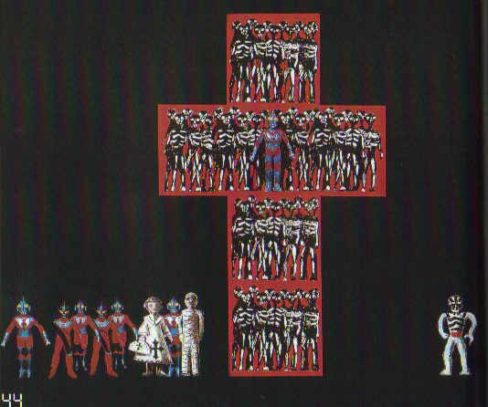 残念ながら、実際にはウルトラマンは登場しません(役人がウルトラマン・タロウっぽかったけど)。こういった十字形が三つ組み合わさって背景を構成していました。