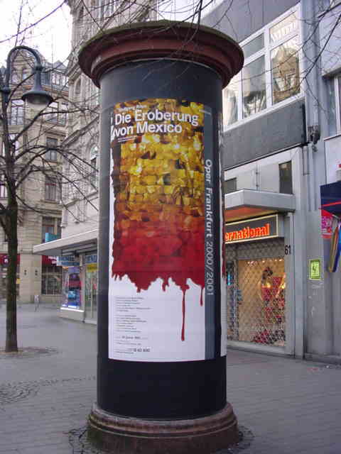 街中のリーム「メキシコ征服」のポスター。プログラムも同じ表紙。11日早朝のカイザー通りにて。