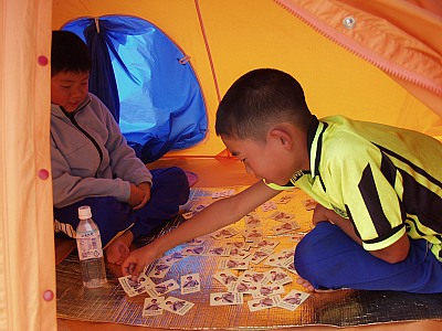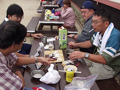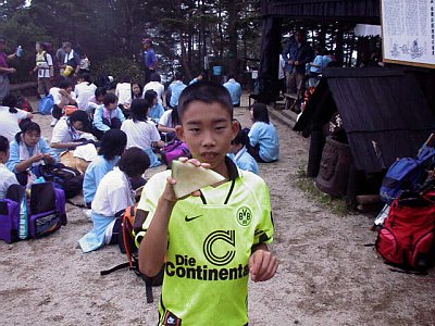 テント場が見えた所で一回休みました。「もうすぐつくのかなあ」と思ってうれしくなりました。それからすぐつきました。ぼくがテント場に一番に足を入れたので、うれしかったです。そしてぼくはCCレモンをのみました。いつものCCレモンよりすごくおいしかったです。それから、お父さんがもってきた魚をたべました。すごくおいしかったので食べすぎて、「つまみがなくなるからもう食べるな。」と言われました。その夜みやじまのおじちゃんが作ってくれたカレーを食べてねました。