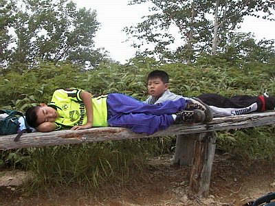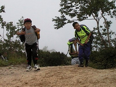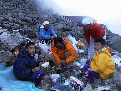 朝ごはんの前に登ったので下りてごはんをたべて出発しました。さいしょの日と同じで登り始めが大へんでした。あと少しで、テント場につくという所でサルの10ぴきぐらいのむれを見ました。野せいのサルを見るのは、はじめてなのでびっくりしたけどうれしかったです。そしてテント場について、ごはんを食べてねました。