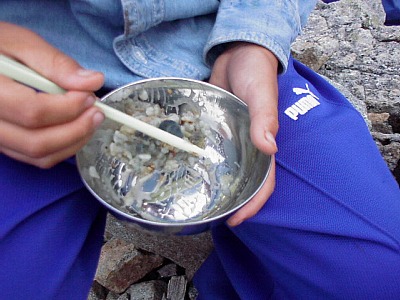 ついてから一番びっくりしたのは、夏なのに雪がのこっているということです。夏、雪がのこっているのをはじめて見たのでびっくりしてなんだかうれしくなりました。その日の夕はんは、それまでに残ったざいりょうで作ったおぞうすいみたいなのを食べました。見ためは、まずそうだったので「やめとく。」とぼくが言ったら、えんまめおじちゃんが「うまいよ、くってみな。」と言っておいしそうに食べていたのでぼくも食べてみたらすごくおいしくてびっくりしました。