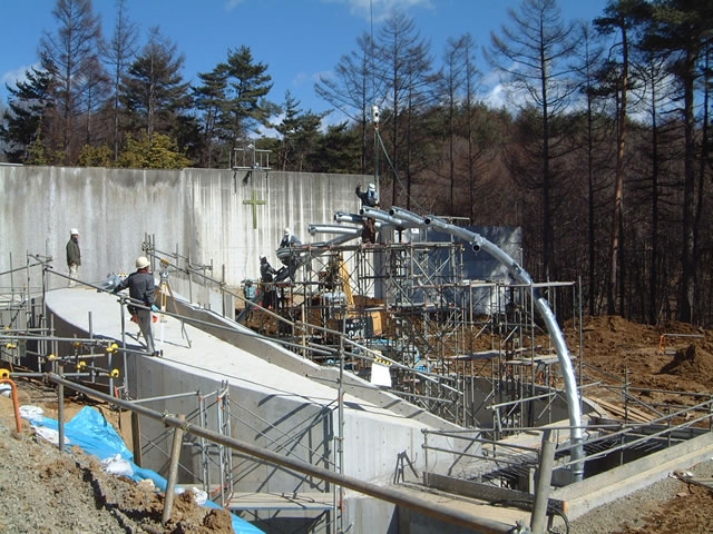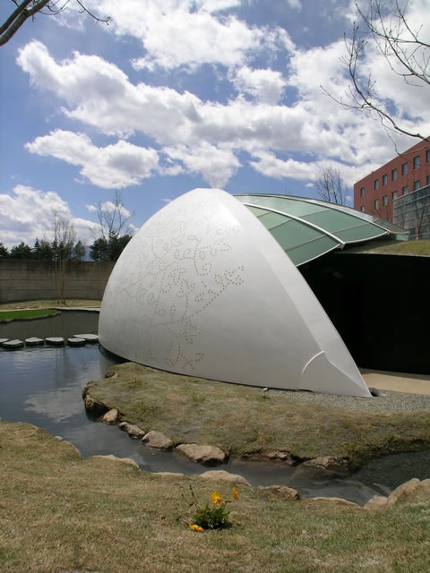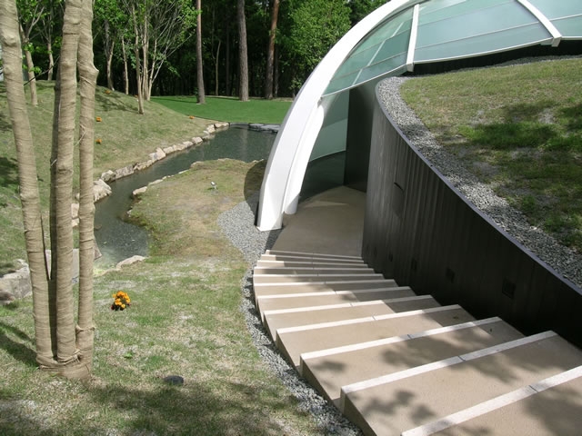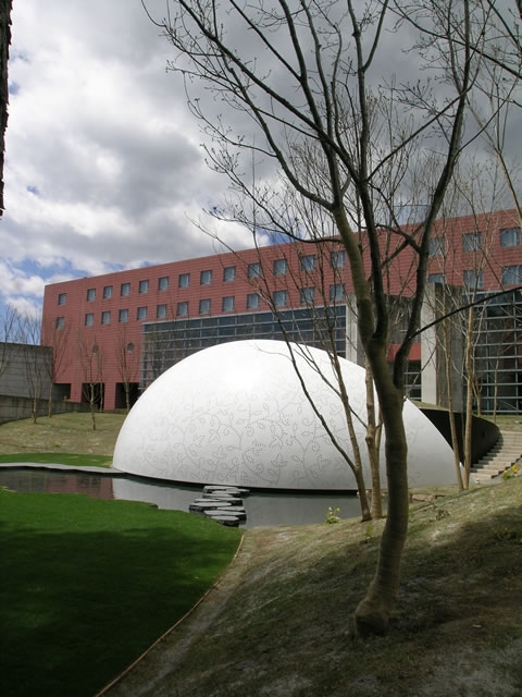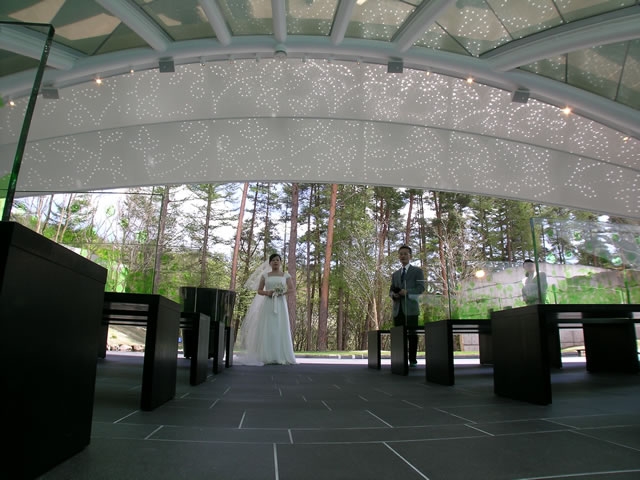 山梨県北杜市小淵沢町にある滞在型ホテル「リゾナーレ」のガーデンチャペル。この建築の象徴的なベール(白い球体部分)は有孔鋼板を曲げ丹念に塗装されたもの。ベール部分は完全な球、ガラス天井を持つ建物側は卵を倒した様な楕円球。この2つの球体で構成された一見シンプルな建築はベール部分が可動するというドラマチックな仕組みを備えている。メインの使用用途である結婚式のクライマックスでベールが静かに開いていくさまは、その場にいる全てに人々に大きな感動を与えると思う。設計はクラインダイサムアーキテクツ。