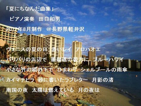 ヴェニスの夏の日 赤いレイ アロハオエ バリバリの浜辺で 珊瑚礁の彼方に ブルーハワイ 小さな竹の橋の下で ひまわり シェルブールの雨傘 カイマナヒラ 砂に書いたラブレター 月影の渚 南国の夜 太陽は燃えている 月の夜は |