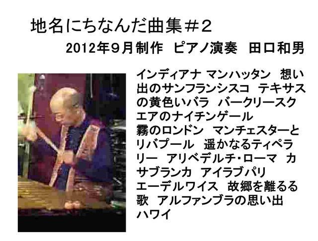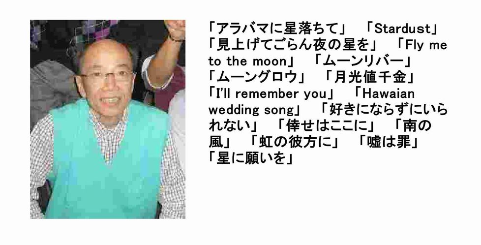 インディアナ マンハッタン 想い出のサンフランシスコ テキサスの黄色いバラ バークリースクエアのナイチンゲール 霧のロンドン マンチェスターとリバプール 遥かなるティペラリー アリベデルチ・ローマ カサブランカ アイラブパリ エーデルワイス 故郷を離るる歌 アルファンブラの思い出 ハワイ |
