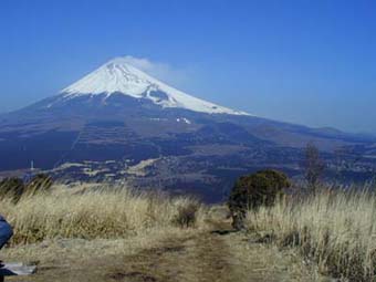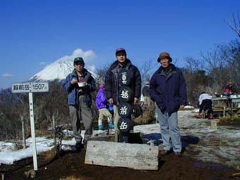 十里木高原駐車場に車を止め、すぐ登りにかかる。富士山は駐車場からも大きく望める。登るに従って演習場、日本ランド、十里木別荘地と裾野が大きく拡がる。最初は茅原を登って行くがすぐ灌木帯に入る。展望の良い地点あたりから氷混じりの雪となりアイゼンをつける。明るい雑木林の中の上り詰めていくとやがてなだらかな傾斜となり12:05頂上に着く。