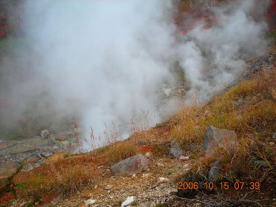7:25 出立。直ぐのところに温泉神社があり、また少し登ったところに三斗小屋温泉の源泉が白煙を上げていました。天候もよく、順調に隠居倉経由熊見曽根に 8:50着。