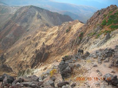 噴火で南面が大きく崩れ荒々しい岩肌見せるが、北面はハイマツのスロープと特異な山容の朝日岳は、山頂のスペースも狭く、登り下りも、写真撮影も順番待ちの状態。