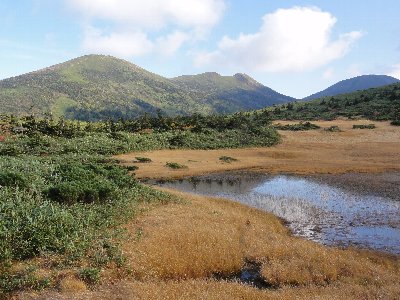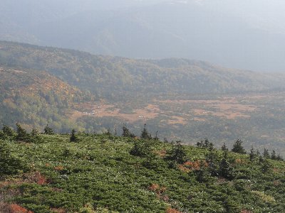 やがて樹高が低く笹が出てくると沢伝いとなり仙人岱に至る。大岳への登りは様相が一変し強風。所々先日の雪が残っていた。大岳は早々に退散し避難小屋まで降りて一息をつく。さらに下っていくと上毛無岱の湿原に出る。気持ちの良い休憩所があり昼食とする。