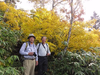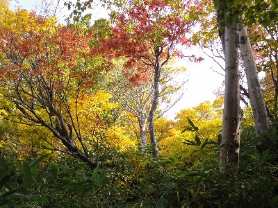 毛無岱の湿原を抜けるとブナの黄色の多い林となる。黄葉したブナの大木がそびえる。今日の宿の酸ヶ湯は紅葉に埋もれていた。