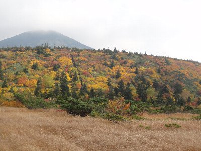青森市街から八甲田ゴールドラインを近づいていくと草原の向こうに雄大な山容を見せてくれる。感嘆の声を上げる所である。裾野の広がるブナ林は薄黄色に色づき始めていた。