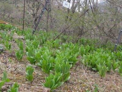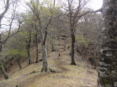 高度を上げるにつれ山稜が広くなりブナなどの大きな木が見られるようになり気持ちの良いところである。頂上近くではバイケイソウの群落があり鮮やかな緑が映える。