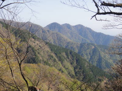 塔ヶ岳からは北岳も含め南アルプスの主要な峰が全部眺められた。頂上はまだ登山者の数も少なく広々としていた。行者岳に向かう途中で木の上で鳴いている鶯を見つけ写真に収める。藪の中でなかなか見つけられない鳥だが高い木の上で警戒心もなくホーホケキョと鳴いていた。やびつ峠に近づくにつれ学生の団体など登ってくる人に会うようになる。