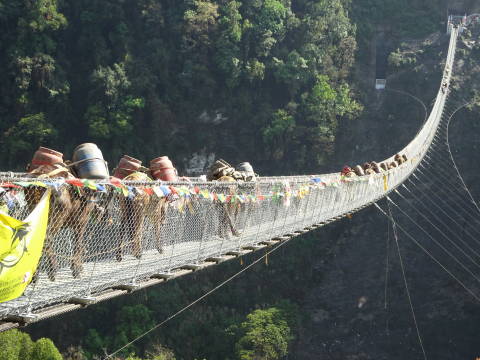 9:10 長いつり橋を渡る。278mあるという。何十頭もの荷物を運ぶ馬と一緒である。意外と揺れないものだ。
