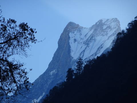 ホテルの庭からアンナプルナ・サウスとヒゥンチュリが奇麗に見えた。アンナプルナ内院はその向こう側にある。うーん、遠いな。