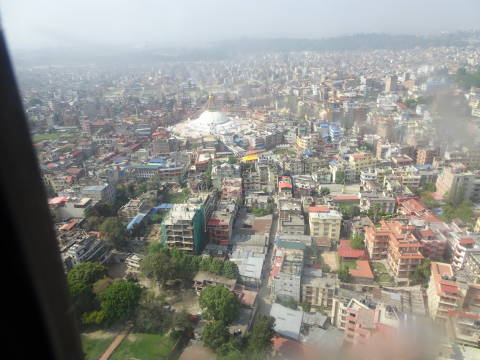 8:00 2機のヘリコプターに分乗し、両側が絶壁のスリリングな飛行で始まるカトマンズ空港まで1時間の飛行。