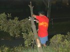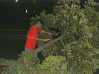 駐車場で鈍い音がしたので覗いてみると、白いステーションワゴンが一台出て行くところ。運転手はこちらを見ている。またうちの車がぶつけられたかと思い、外に出てみるがどれも異常はない。聞こえた音も車同士のものではないと、周りのフェンスなどを見るが、その車がいたと思えるあたりには特に異常はみつからない。気のせいかと思い店に入ろうとしたときに、なんだか見慣れた風景と違う様子が目に入った。歩道側の大きな「マテバシイ」が一本倒れているのである。倒れた木は歩道を道幅いっぱいにふさぎ、人が通れない状態になっている。車はコンクリートの車止めを乗り越えて、木を倒してようやく止まったようである。 電話で夫に報告すると、良くしたもので彼はすぐにのこぎりを手に現れた。二人で何とか立て直そうとするが、しっかり根を張っている木はちょっとやそっとでは動かない。あきらめて切ることにする。マテバシイはものの10分ほどで、あえなく解体されてしまった。まるで運命をトマトと共にしているようで、思わず「ご苦労様」と心の中で手を合わせた。