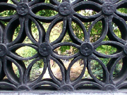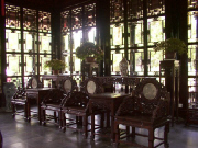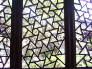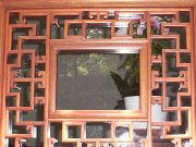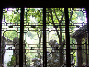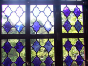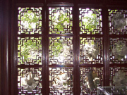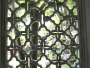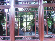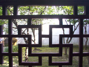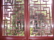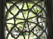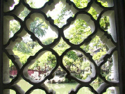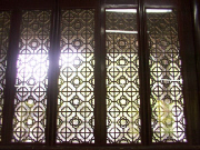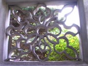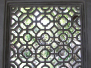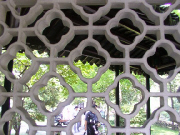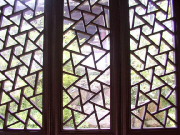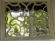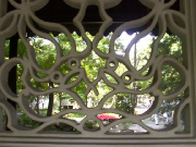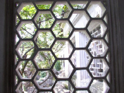 建物の窓や、庭を仕切る塀には花や雲などの自然をモチーフにしたものや、幾何学的なデザインの格子がはめられている。