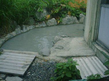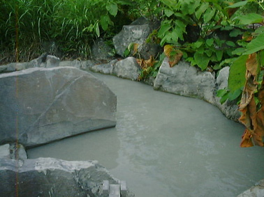 源泉の大湯沼から引く温泉は、石灰色をしたもので、泥温泉と呼ばれているらしく 入ると底の方が泥だらけです。 ここは内湯は男女別ですが露天風呂は混浴です。 奥の方に湯の花を溜めた深さ30cmくらいの浴槽があって、そこで泥パックができます。 ここは最高でした。この泥パックをしたら1,2日は臭いがとれなかった。(笑)