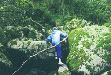 | 叩きで釣る長男 この日3尾をあげる ここはちょっと開けているが、本物の「藪」 釣りにくいが野生のヤマメがかろうじて棲息している |