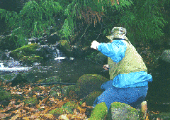 | 藪でフライトと聞くと、首を傾げる人が多いかもしれない しかし、フライは最強の藪の毛バリ釣りかもしれない とはいえ、教科書に出てくるようなキャストの出来る場所 は限られている。そこを素通りしていてはもったいない 藪の美しい渓魚との出会いのを、みすみす失いかねない まず、バックキャストはしない ポイントまで届くぎりぎりの長さのラインを右手に持って 左手でフライから50センチくらい、チペットとリーダー の結び目付近を持って構える 少しでも空間を稼ぐために必ず膝をついて低く構える 左手のリーダーを軽く送り出すと同時に、右手を鋭く前に つきだし、次の瞬間手首を返してラインを送る これだけで(少し練習が必要かもしれないが)多少でも 距離が稼げる この距離が稼げるというのは、藪では貴重である 藪は接近戦、その中でわずかでもプレッシャーを押さえる ことの出来るフライは有利だと思う テンカラ風の釣り方、叩き風の釣り方は教科書のとおり 一度上流に廻って、ラインを下流へと送る方法も非常に 効果がある 取り回しが面倒なことはあるが やはりフライは最強か? (今後ここに写真を貼ります) |