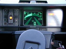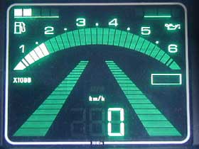 さらに拡大してみましょう。上の弓形部分はタコメーター、速度は数字で示されます。不思議なのは英国仕様なのに km/h 表示な事ですね。
