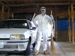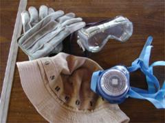 左上よりピッグスキンのグローブ、ゴーグル、キャップ、防塵マスク。この他、ツナギと厚底靴(サンダルではない)を装着しています。