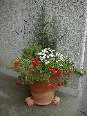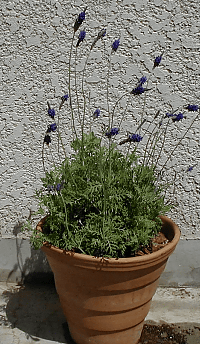 ![]() ゼラニュームとチェリーセージが咲きそろっている。(上) レースラベンダー...風に揺れる花と繊細な葉が好き。 (下)でも単独だとちょっと寂しい感じだったので寄せ鉢へ。 |