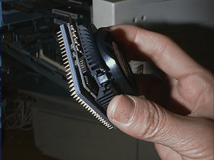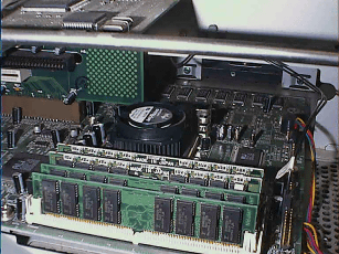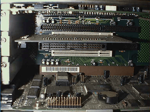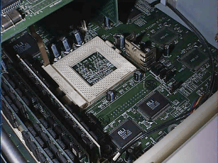 | 拡張スロットのスロット3にSCSIカードを取り付けてある。 | 冷却ファン用電源ケーブルを外しCPUソケットのレバーを 開きpentiumプロセッサを外したところ。 |